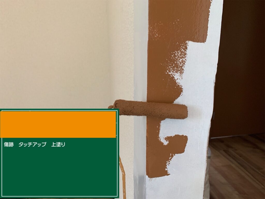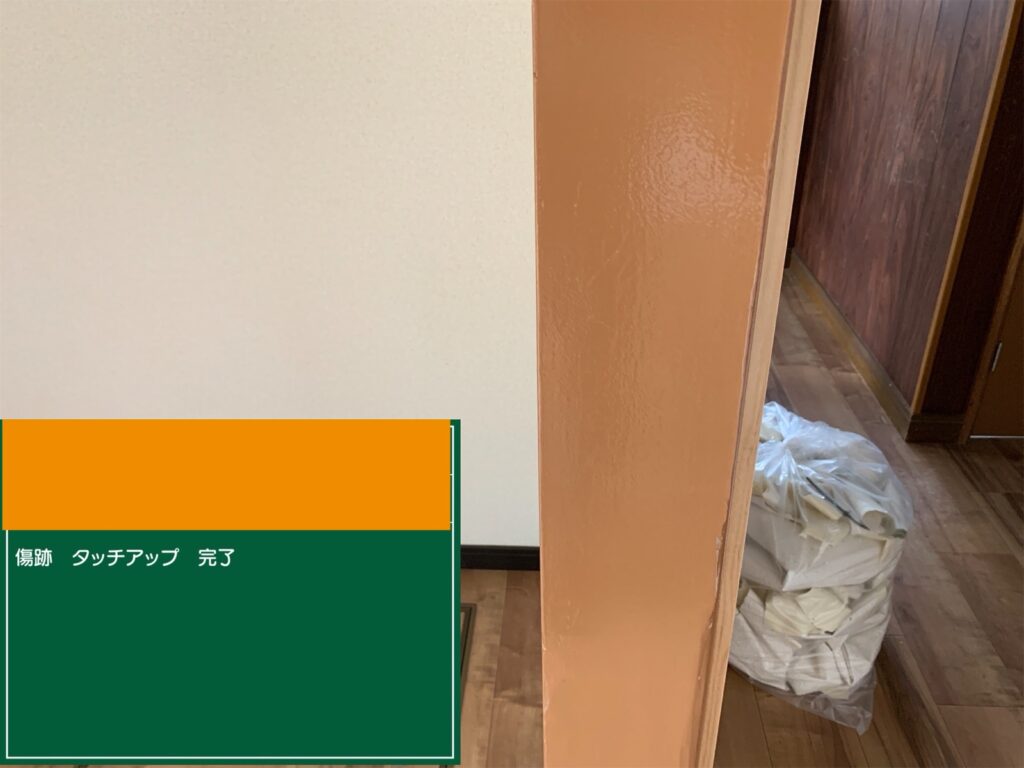 塗料が完全に乾いたら、マスキングテープを外して補修完了です。傷が補修され、木枠が新たに甦ったのを見れば、その美しい仕上がりになります。